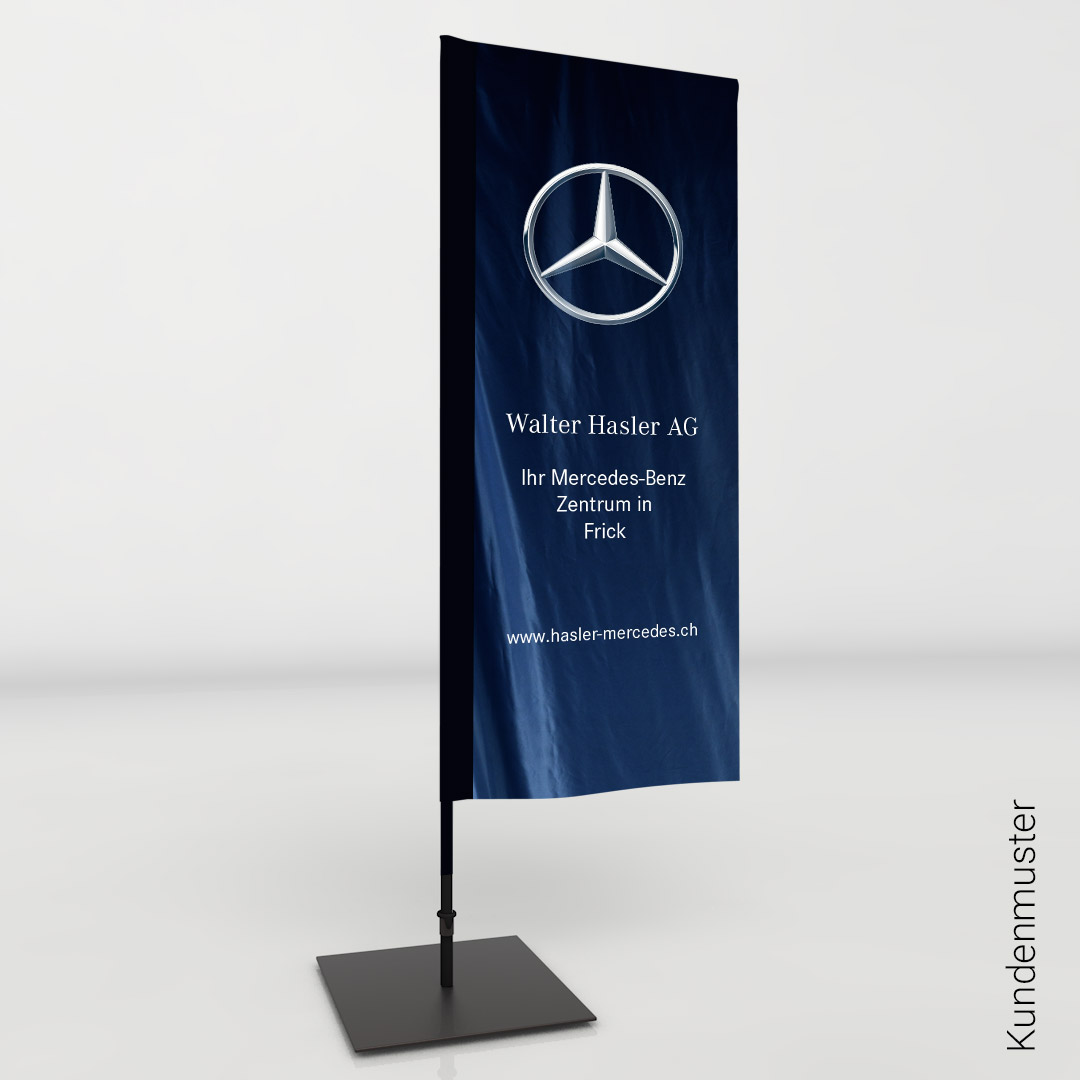 Im Außenbereich weht die Beachflag "Actionflag" optimal im Wind. Alle Bodenlösungen ermöglichen eine 360° Drehung.