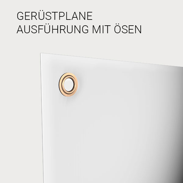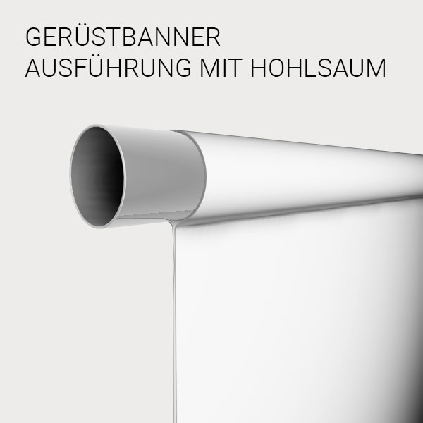 Wir bieten Ihnen zwei Ausführungen. Entweder als Gerüstbanner mit einem Hohlsaum oben und unten, durch den die Handlaufstangen des Gerüsts geschoben werden. Oder als Gerüstplane alle 50 cm geöst, dies ist die einfacher zu montierende und flexibler einsetzbare Variante. Das Werbebanner wird dann einfach mit Kabelbindern befestigt.